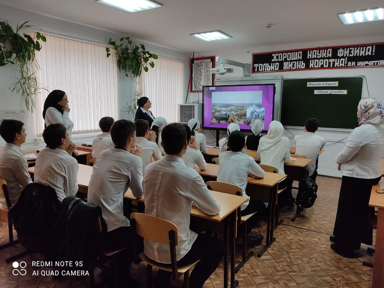 18.03.2021Сегодня состоялся Всероссийский открытый урок «Крым – моя история». На просмотре урока присутствовали учащиеся 8-11 классов. Учащиеся узнали, какие народы, цивилизации, а также культурные и государственные деятели навсегда вошли в историю полуострова, познакомились с его главными достопримечательностями и вдохновляющей природой, а в дальнейшем смогут получше присмотреться к своей собственной малой родине и принять участие в новом увлекательном и полезном конкурсе в социальных сетях.