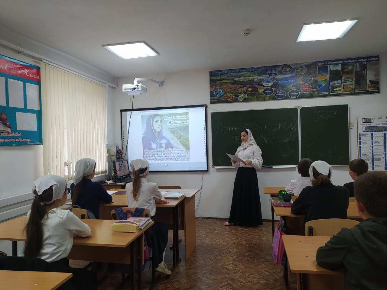 В честь этого праздника во всех классах проведены классные часы и беседы на различную тематику, посвященную чеченской женщине. Были подготовлены презентации про местных женщин –ветеранов педагогического труда, тружениц колхозов и совхозов. Были сделаны плакаты с фотографиями из жизни этих великих женщин.