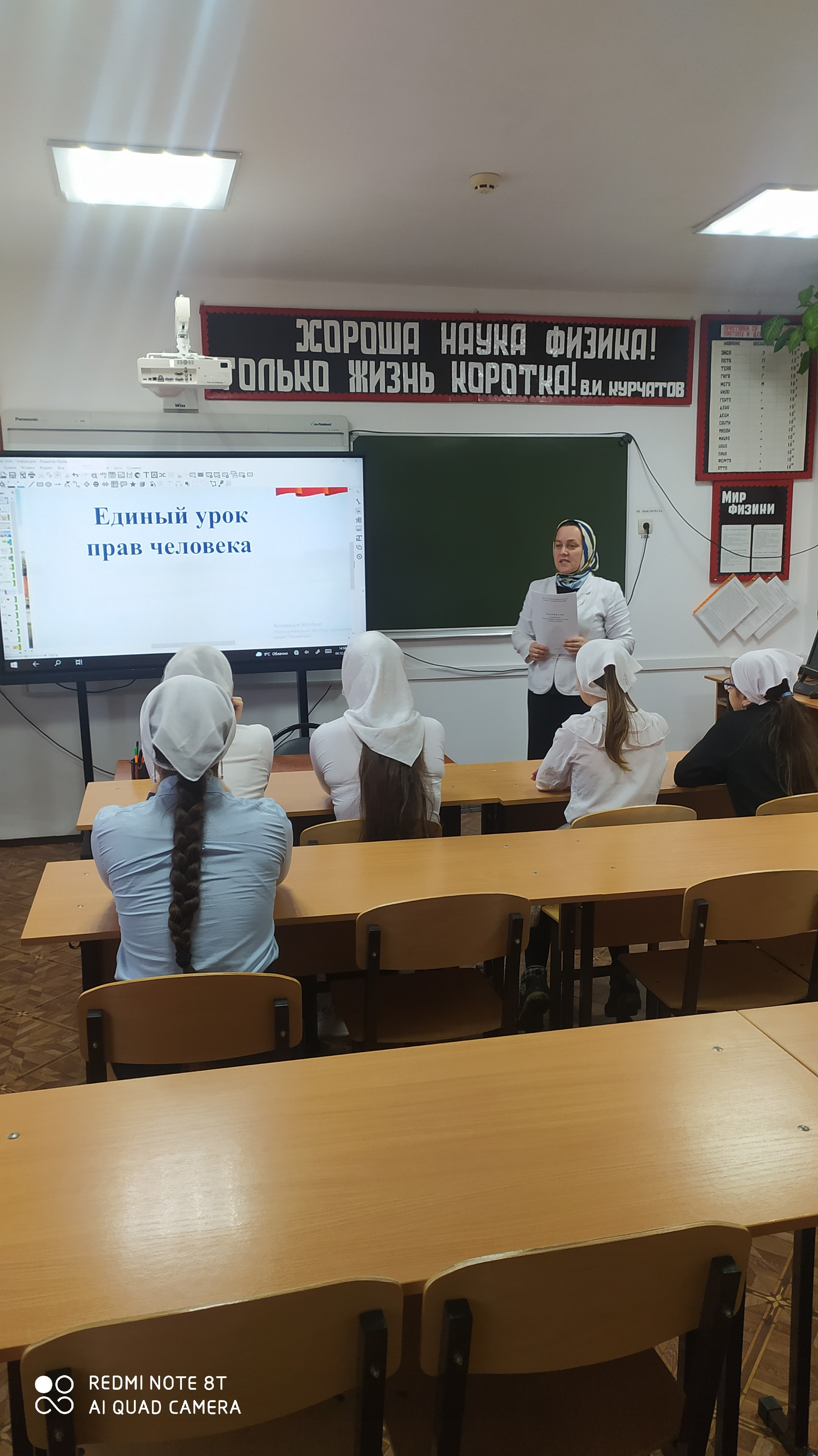 При проведении единого урока учитель обществознания Сириева Зулихан Мухадыевна пользовалась методическими материалами с рекомендациями, подготовленными аппаратом уполномоченного по правам человека в РФ.