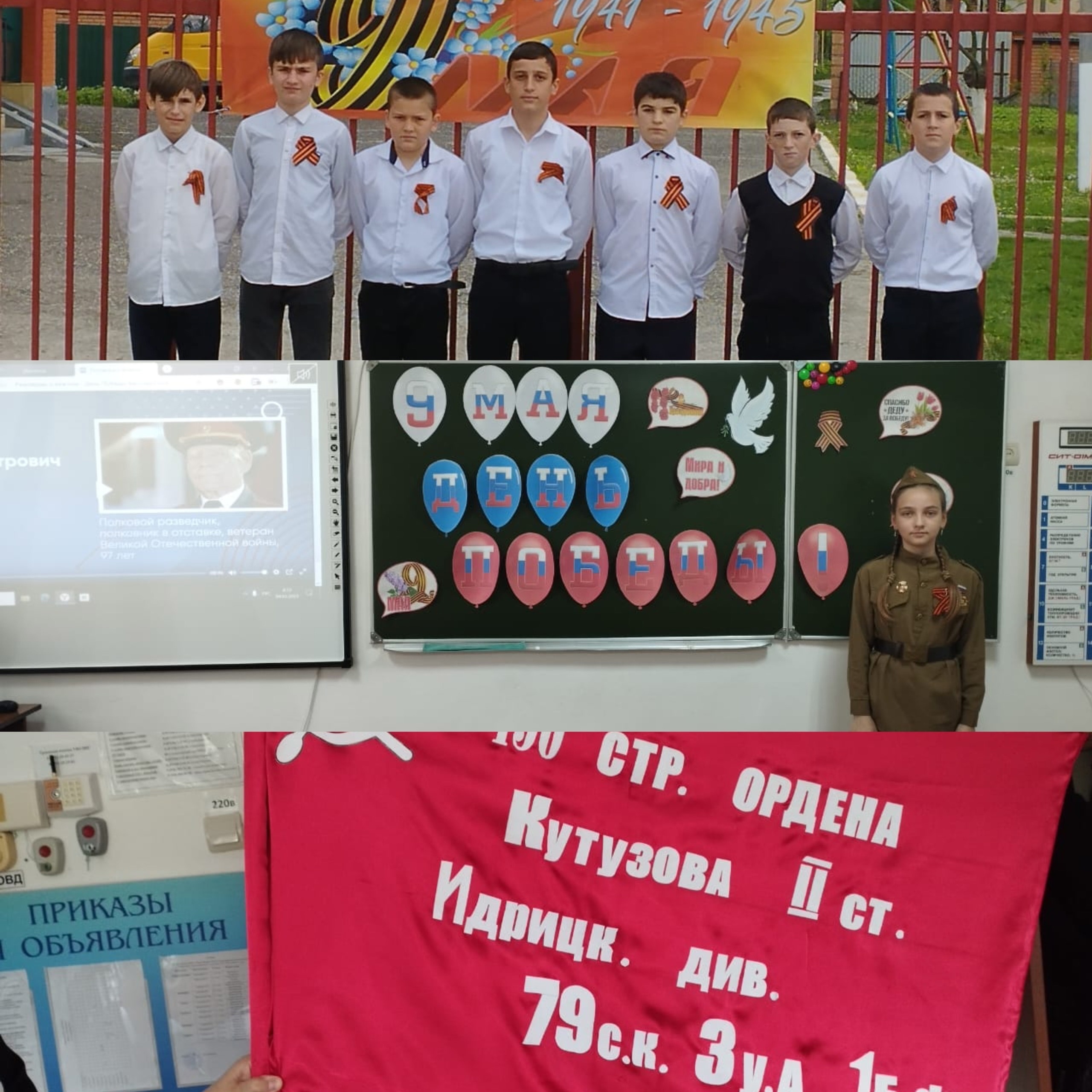 05.05.2023Наша школа в рамках торжественного школьного мероприятия, которая прошла 4 мая 2023 года, организовали акцию «Бессмертный полк».Все 98 учащихся, участвуя в акции «Письмо Победы» написали благодарственные письма ветеранам войны и участникам СВО.Всей школой участвовали в акциях «Георгиевская ленточка», «Стена памяти» и «Окна Победы».Педработники и учащиеся, имеющие VK приняли участие в акции «Смена аватаров в соцсетях». Участники этой акции заменили свое фото на аватарке фотографией своего прадеда – ветерана Великой Отечественной войны.Для сегодняшнего мероприятия была сделана копия Знамени Победы и школьная заменная группа вынесла Знамя Победы на торжественное мероприятие и склонила ее при почтении минуты молчания в память о погибших на войне.Право быть знаменосцем и вынести знамя Победы было предоставлено лучшему ученику школы Садулаеву Якубу.
