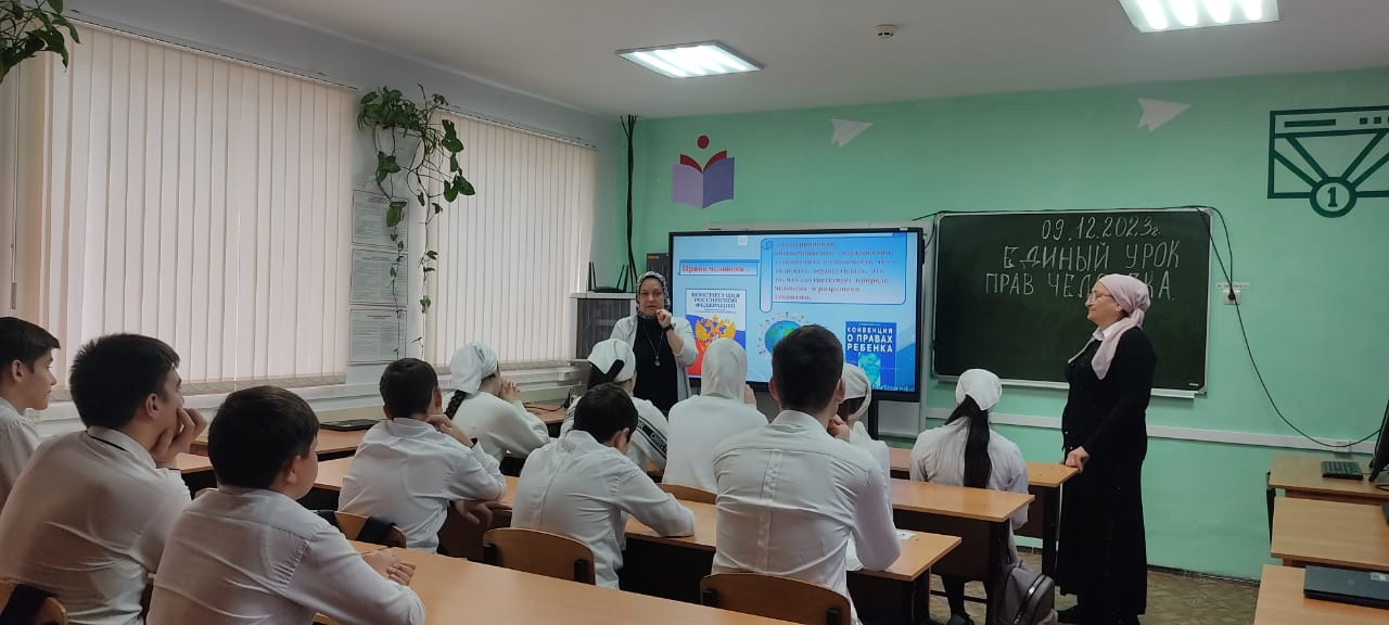11.12.2023Учитель обществознания Сириева З.М. и истории Сулумова Н.А. с учащимися 9-11 классов провели традиционный урок права, на котором вместе с учащимися ознакомились и разобрали основные права, но и обязанности каждого человека. Урок был очень интересным.