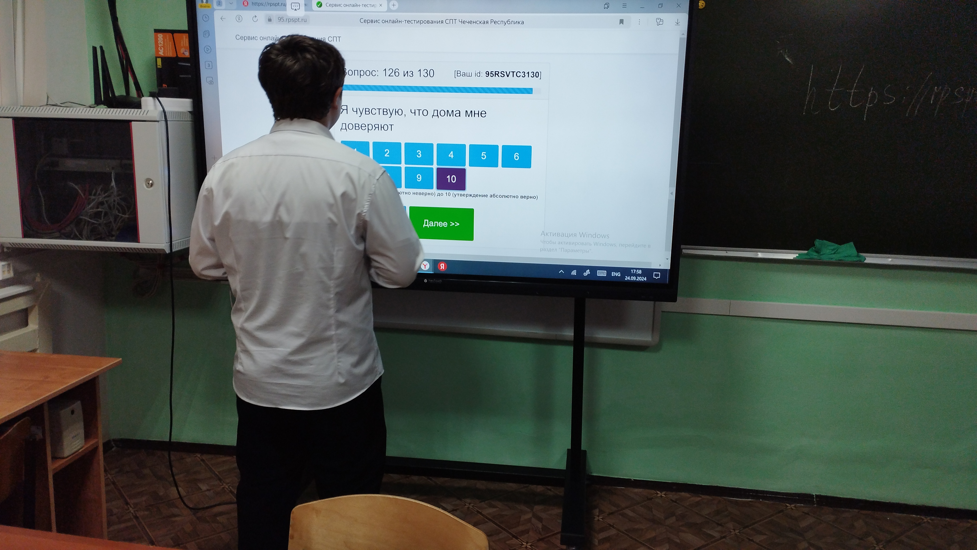 24.09.202424 сентября 2024 года в нашей школе дан старт социально-психологическому тестированию средиобучающихся с использованием Единой методики СПТ от 13 лет и выше.В тестировании участвовало 38 учащихся с 7 -11 класс. ЕМ СПТ осуществляет оценку вероятности вовлечения в адекватное поведение на основе соотношенияфакторов защиты, воздействующих на обследуемых, выявляет повышенную и незначительную вероятностьвовлечения в зависимое поведение.Перед объявлением о начале тестирования проведена подготовительная работа с учащимися, спедагогическим коллективом, а также с родителями: беседа для мотивации учащихся и родительскоесобрание. Прямо на собрании родители заполнили анкеты, выражая свое мнение о СПТ. Написалисогласие на участие своего ребенка в СПТ, если ребенку нет 15, а с этого возраста дети дали согласие самостоятельно.