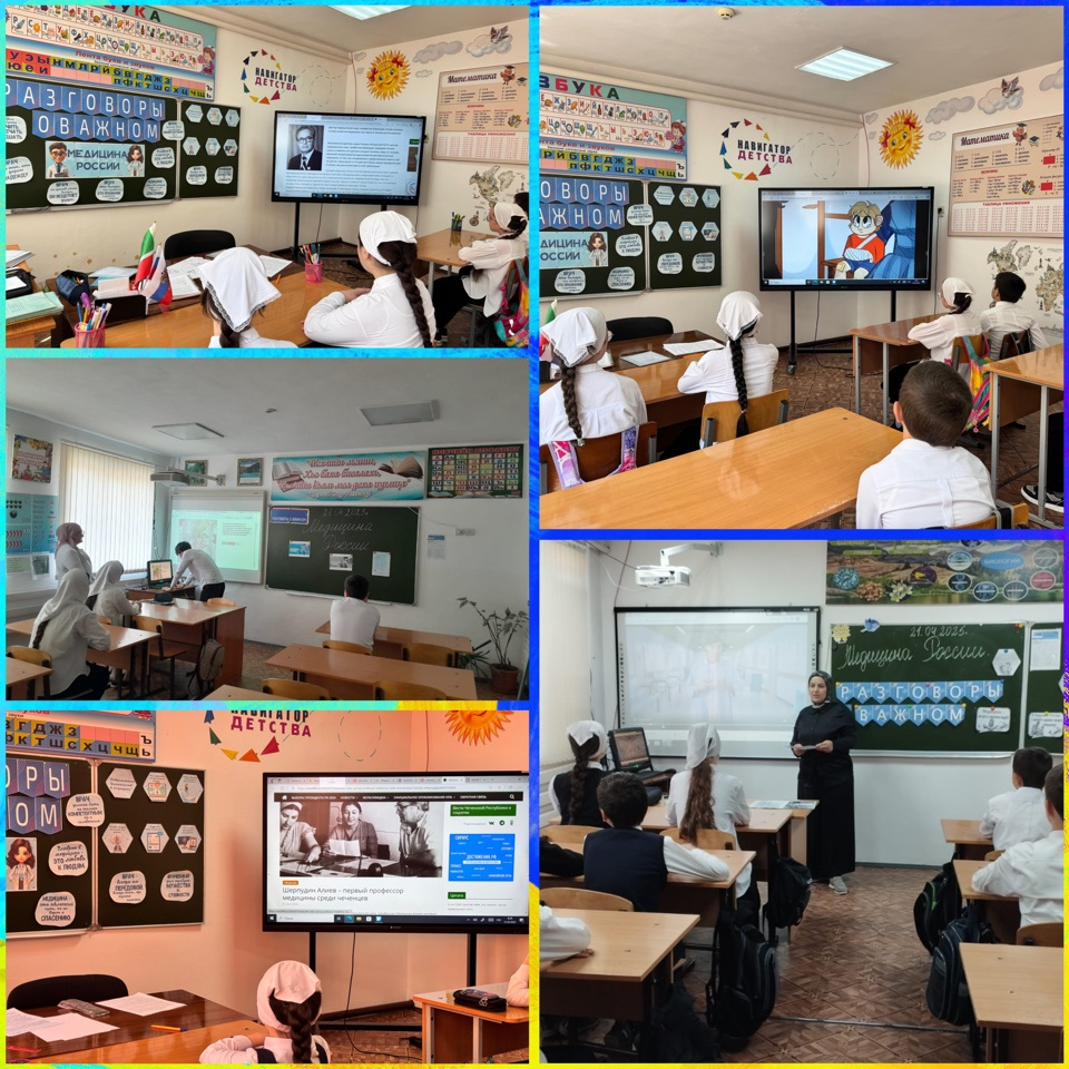 Но прежде чем начать внеурочное занятие провели церемонию поднятия флага РФ и ЧР с исполнением Гимнов в «живую». Ребята узнали о достижениях известных российских врачей, разнообразии медицинских профессий, а также применении современных технологий для постановки диагнозов и лечения. Учащиеся посмотрели видео «Путешествие в историю российской медицины: от травников до великих врачей», в котором были обозначены основные этапы развития института медицинской помощи в нашей стране. Помимо этого, учащимся было предложено выполнить интерактивное задание «Правда или вымысел», определив, какие из приведенных высказываний о медицине являются фактами, а какие — мифами. Учащиеся узнали о том, что такое медицина, и в чем состоит работа врача. Им также рассказали о том, какие специалисты работают в больницах, и как они обеспечивают функционирование медучреждения. . Учащимся также рассказали о достижениях известных чеченских врачей, таких как Шахаб Эпендиев, Шерпуддин Алиев, Хасан Баиев и многих других. Ребятам также напомнили о подвигах медицинских работников во время Великой Отечественной войны. В конце урока ребята обсудили важность ответственного подхода к заботе о здоровье.
