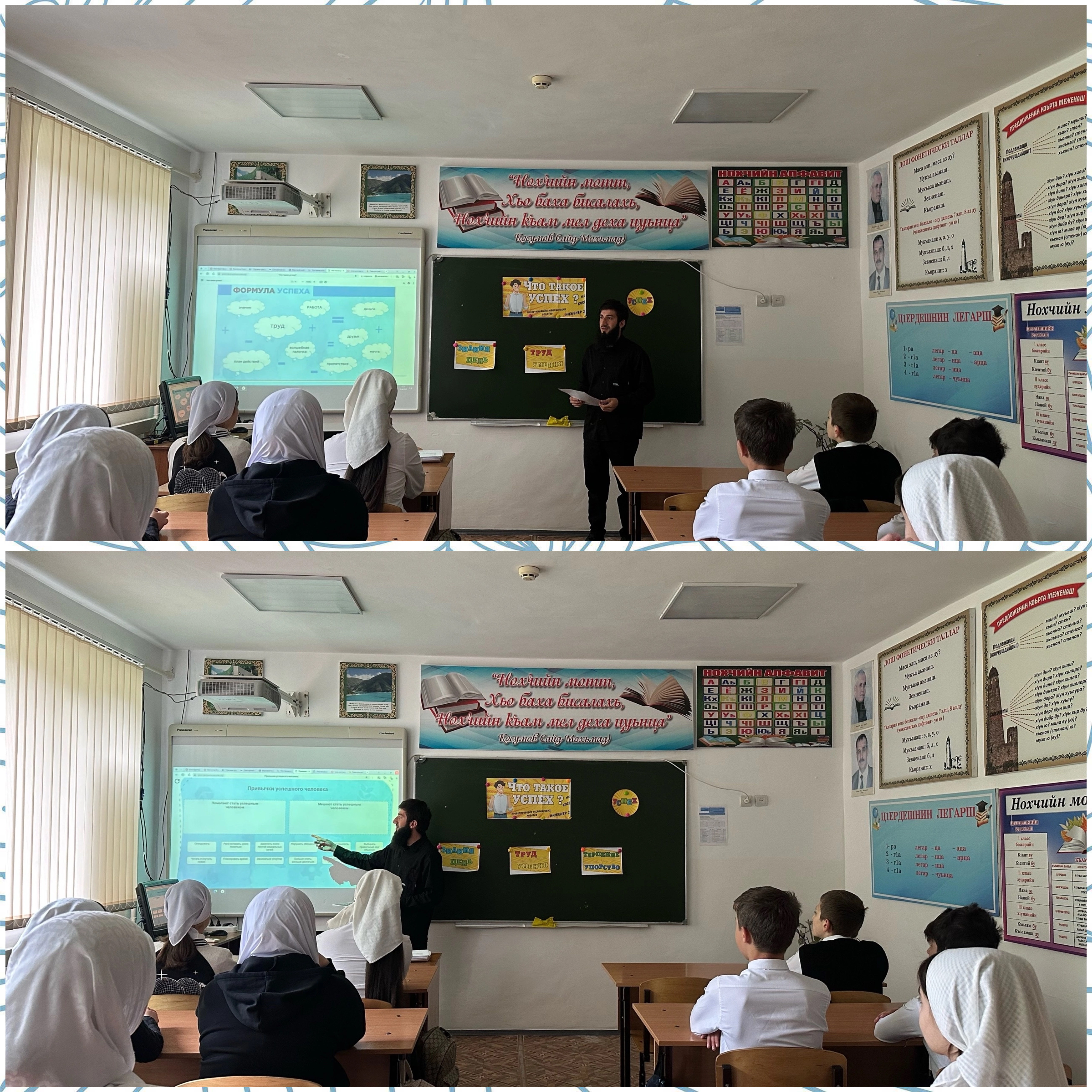 Классные руководители применили на занятии и региональный компонент. В 10 и 11 классах рассказали об успехах людей, которые добились успехов в труде. Это такие как: Динаев Алихан Мовладиевич – победитель Всероссийского конкурса «Учитель года» в 2018 году и автор множества книг для подготовки к ЕГЭ по обществознанию, и , конечно же, про Первого Президента ЧР Кадырова Ахмат-Хаджи Кадырова, который восстановил мир и порядок в нашей республике.