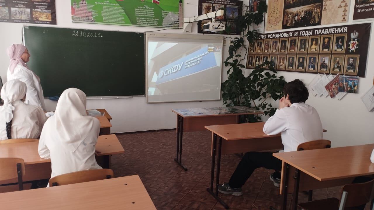 Фестиваль организован Северо-Кавказским федеральным университетом в рамках Десятилетия науки и технологий при поддержке Министерства образования и науки России. Классный руководитель 11 класса и учитель истории Сулумова Напу Абдурахмановна рассказала старшеклассникам про факультеты, специальности и направления, правила приема и сроки подачи документов в СКФУ.