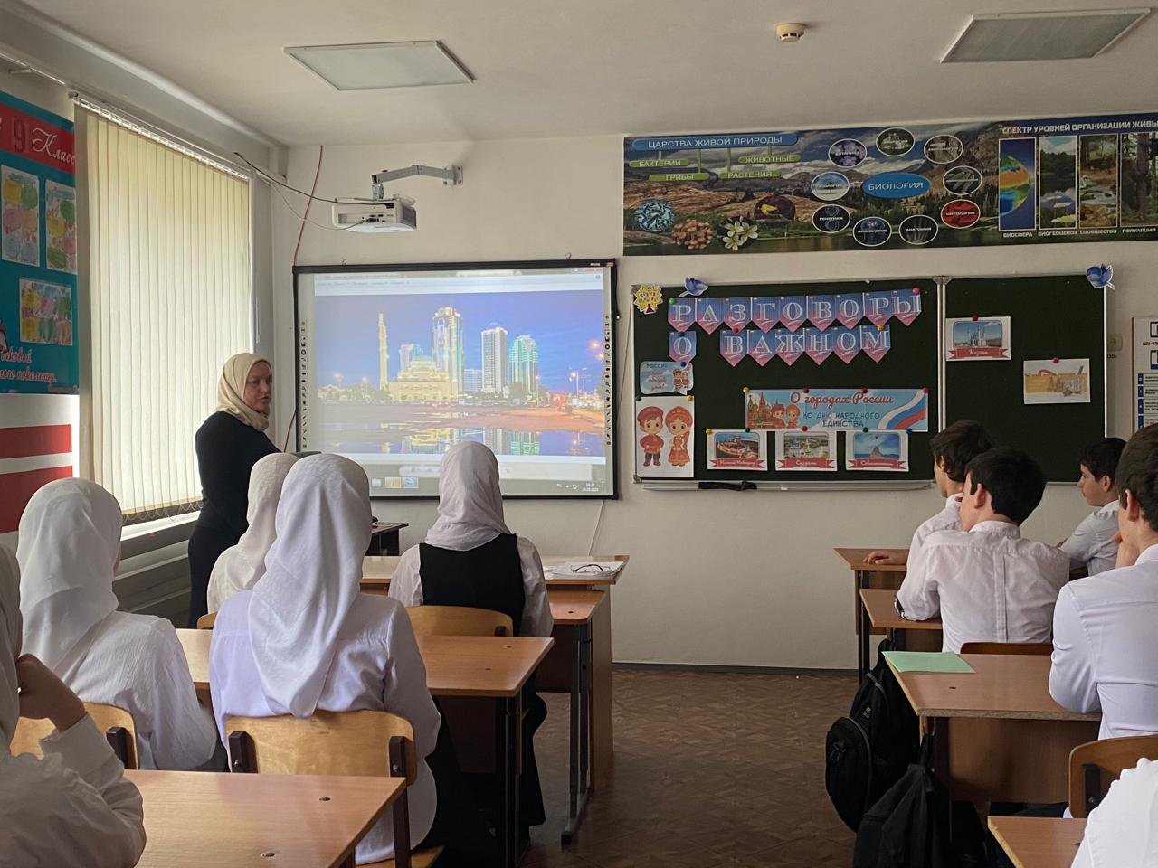 Ведущая, зам. по ВР Сулумова А.А. ознакомила присутствующих с темой предстоящего занятия и с планами на эту неделю. Затем, ребята отправились на очередное занятие «Разговоры о важном». Тема: «О городах России. Ко Дню народного единства».