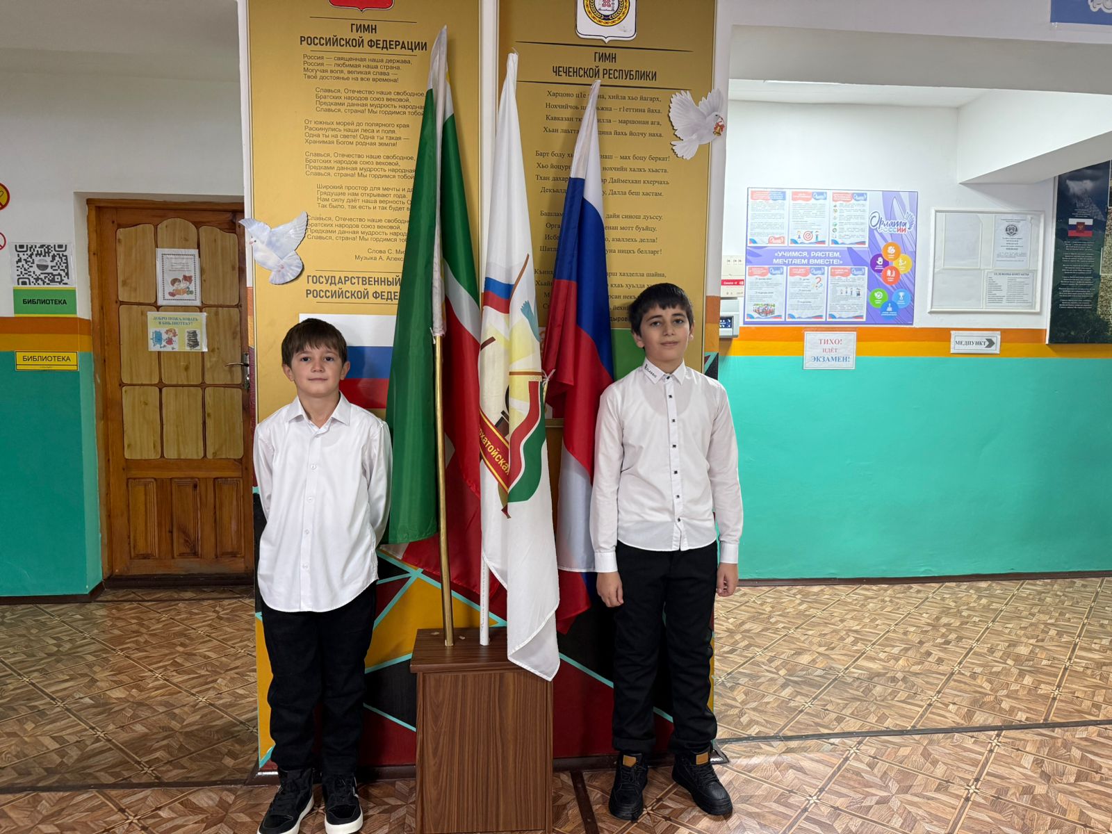 Классные руководители красочно оформили доски, но перед началом урока провели церемонию выноса и установки государственных флагов РФ и ЧР.